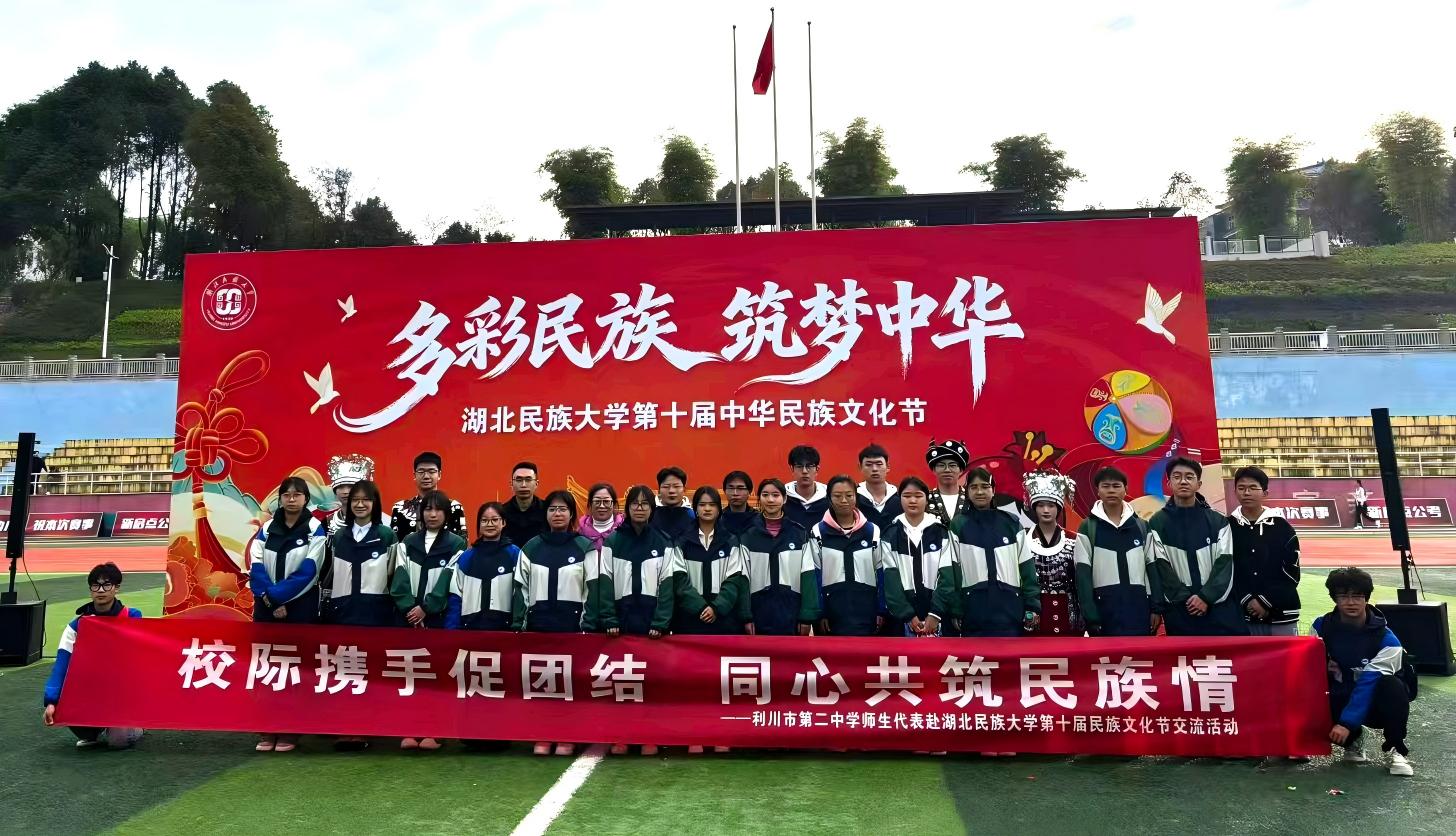 2025-12-05 14:56:21 点击量:2025年11月15日,利川市第二中学20名学生代表在老师带领下,满怀期待地走进湖北民族大学,共同参与了以“多彩民族,筑梦中华”为主题的第十届中华民族文化节。此次活动是落实两校托管帮扶协议、深化交流合作的重要实践,也为中学生提供了一次沉浸式感受中华优秀传统文化魅力的宝贵机会。
