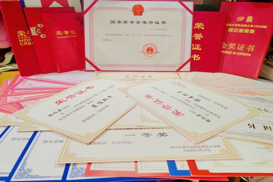 编者按:从中国国际大学生创新大赛金奖获得者到国家奖学金得主,从红色宣讲员到学生工作骨干,她在学业、竞赛、实践的赛道上一路奔跑,用汗水浇灌成长,用热爱奔赴理想,她以“背挺直一点,脸皮厚一点再往前站一点”为座右铭在思政沃土上深耕不辍,在青春征程中勇毅前行。她就是湖北民族大学马克思主义学院思想政治教育专业2023级胡裕君。