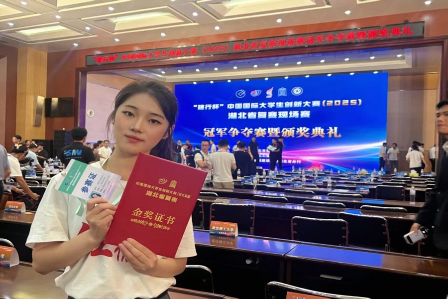 加入红徽章项目组后,她从普通成员成长为负责人,带领团队以宣讲歌舞形式传播红色文化。备战中国国际大学生创新大赛省级比赛时,团队历经数月梳理的项目逻辑被专家全盘否定,距离省赛仅剩十余天,压力扑面而来。“这个项目凝聚了团队前面五届人的心血,我不能让它在我手里停步。”怀着这份责任感,她在5A701教室熬夜重新梳理逻辑、优化方案,经过团队成员反复打磨,最终团队斩获湖北省金奖、国家级铜奖。