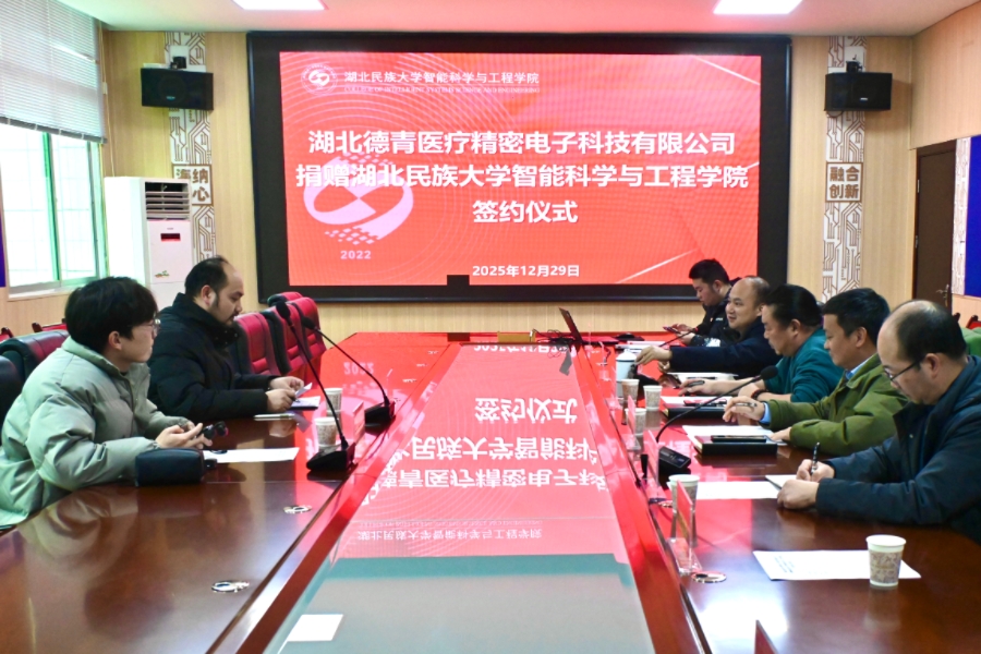 12月29日下午,湖北德青医疗精密电子科技有限公司向湖北民族大学智能科学与工程学院捐赠签约仪式在智能学院举行。德青医疗向我校教育发展基金会捐赠90万元,用于支持智能学院学科建设、人才培养及科研创新,进一步深化校企合作,推动产学研融合发展。捐赠仪式现场智能科学与工程学院院长陈世强围绕学科建设、师资力量、人才培养及产学研合作等核心领域,全面介绍了学院的发展现状与优势特色。他表示,此次与德青医疗的携手,是...