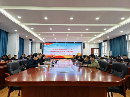 本网讯(邓慧仪/文 李晓琴/图)为进一步加强我院师德师风建设,深入贯彻习近平总书记关于教育的重要论述,大力弘扬教育家精神,进一步强化师德师风建设的重要性、必要性、紧迫性,根据学校《关于组织开展2025年师德师风学习教育的通知》(第三期)的相关要求,经济与管理学院于2025年11月5日上午08:30在附303会议室召开全院教职工大会,集中组织开展第三期师德师风专题学习教育活动,陈霞书记主持会议。