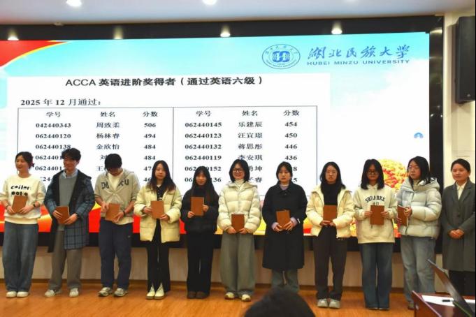 本网讯(记者 佘思咏 刘晨怡/文 张玉珊 彭如妍/图)2026年3月22日,经济与管理学院会计学ACCA方向班2025年秋季学期成果表彰大会在经管楼附303会议室举行。高顿教育湖北省区渠道经理谢晖,高顿教育高校事业部华中区运营胡伊宁,湖北民族大学教务处副处长朱廷辉,经济与管理学院党委书记陈霞,副院长冉瑞恩,会计学系主任刘洁玫以及2024、2025级ACCA方向班全体学生参与本次活动。会计学系副主任张尊担任本次活动主持人。