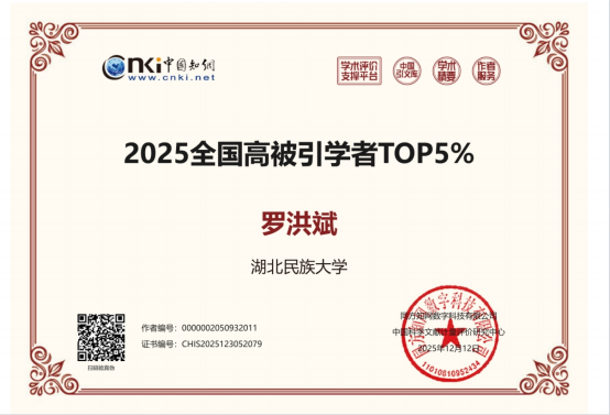 湖北民族大学图书馆馆长罗洪斌教授入选2025年度“全国高被引学者TOP5%”