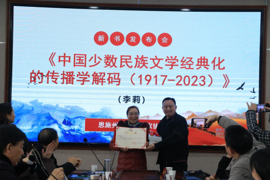 2025年12月27日,我校文学与传媒学院李莉教授新著《中国少数民族文学经典化的传播学解码(1917—2023)》发布会在学院成功举行。作为我校重要的学术成果,该书的出版是学界对少数民族文学研究的一次纵深推进,亦是对“倡导全民阅读,建设书香社会”国家号召的积极响应。