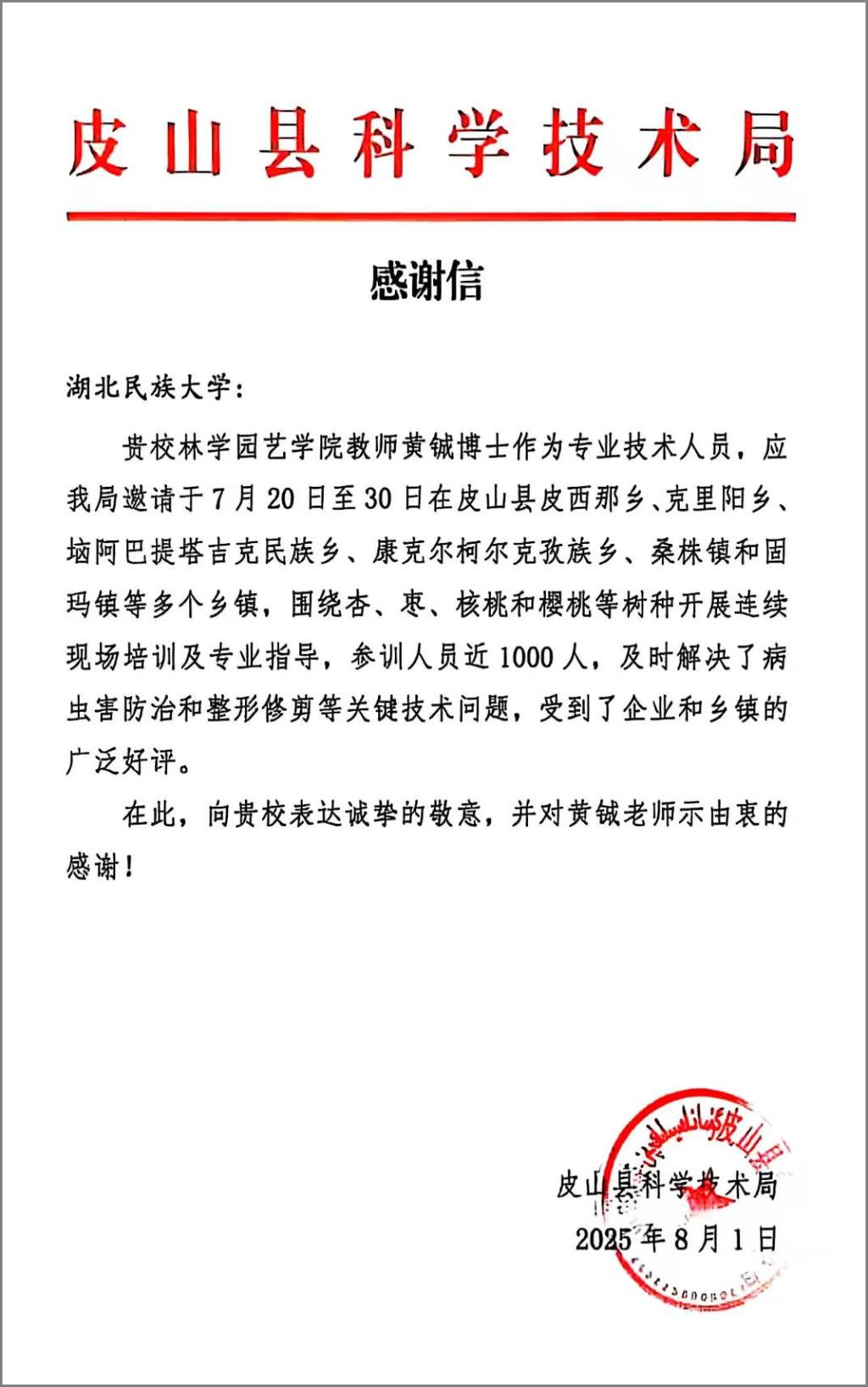 培训结束后,皮山县科技局专门寄来感谢信,对黄铖老师的辛勤付出和我校的大力支持表示高度赞赏和诚挚感谢。信中特别提到,此次培训内容实用、组织有序,切实解决了林农在生产中遇到的技术难题,体现了高校服务社会的责任与担当。(通讯员:余慈爱,编辑:黄铖,审核:胡海剑)