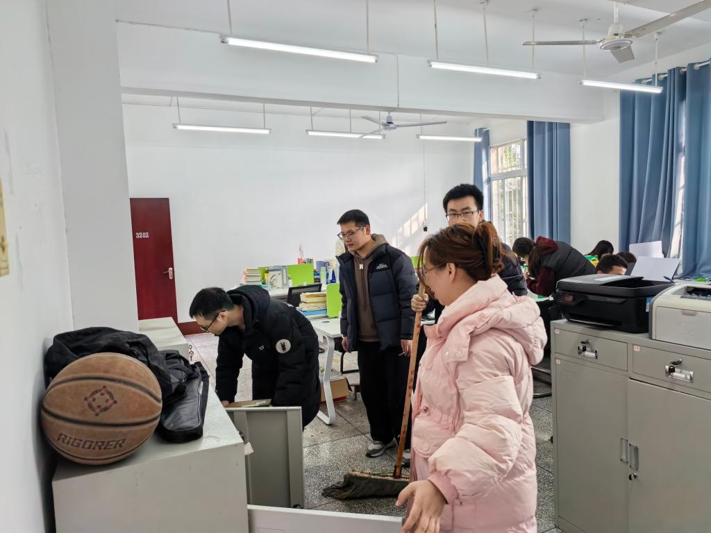 活动中,同学们分工协作,扫地、擦窗、整理桌面、归置物品,一场热火朝天的“焕新行动”在全院铺开。有的同学踮脚擦拭高处玻璃,不放过一丝灰尘;有的同学细心整理公共区域文件,将打印机、饮水机等设备摆放得井然有序;有的同学专注清理卫生死角,用小刷子将墙角、桌缝的污垢彻底清扫。大家各司其职又默契配合,杂乱桌面渐归规整,蒙尘门窗重焕透亮,整个学习室在众人的共同努力下,一步步褪去“旧颜”换“新貌”。