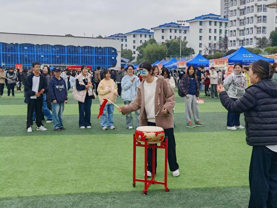 我院以苗族传统游戏“蒙眼敲鼓”为特色项目,精彩亮相民族文化节游园活动。活动中,同学们身着精美苗族服饰,向参与者介绍苗族的历史文化、服饰特色及游戏规则,吸引众多学生驻足参与。“蒙眼敲鼓”趣味互动游戏不仅带来欢声笑语,更让参与者在游戏中深切感受到苗族文化的独特魅力。