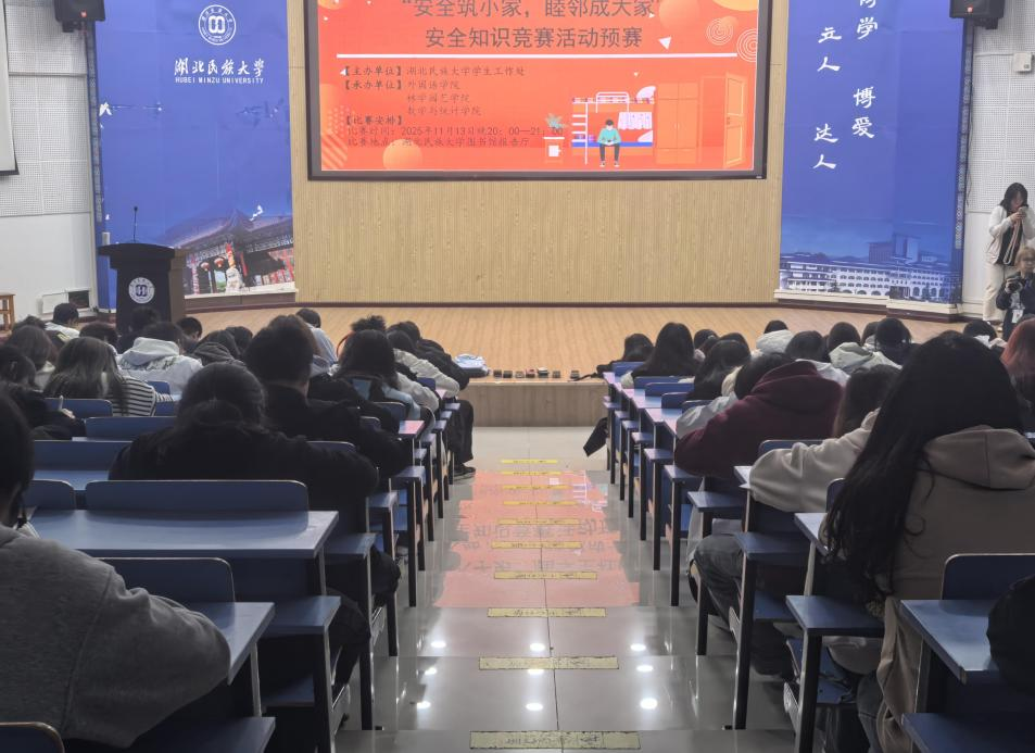 为增强学生安全意识,营造和谐互助的社区氛围,11月13日晚,湖北民族大学第一届学生社区文化节“安全筑小家,睦邻成大家”安全知识竞赛预赛在图书馆报告厅顺利举行。本次活动由外国语学院、林学园艺学院、数学与统计学院联合承办,吸引了全校各学院学生以寝室为单位组队参与,营造了浓厚的校园安全文化氛围。