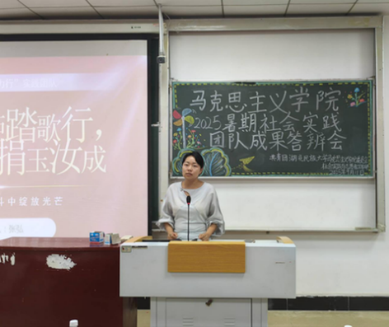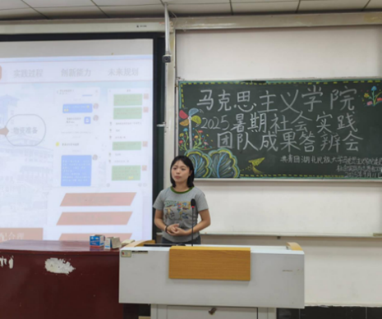 本次答辩会共有9支实践团队参与,团队选题紧扣时代脉搏与民生关切,涵盖乡村产业振兴、红色文化推广、非遗技艺传承、绿色低碳发展、基层治理等前沿领域。答辩采取“5分钟团队展示(PPT阐述)+2分钟评委问答”模式,各团队围绕团队介绍、实践背景、内容、过程及成效依次展开汇报。其中,湖北民族大学“思源力行”实践团队依托思政专业优势,开展“场馆里的‘大思政课’:青年红色讲解员赋能计划”,通过基地讲解、实地考察、线上宣传及“思政+广编”融合模式,服务近千余人,成为答辩亮点。