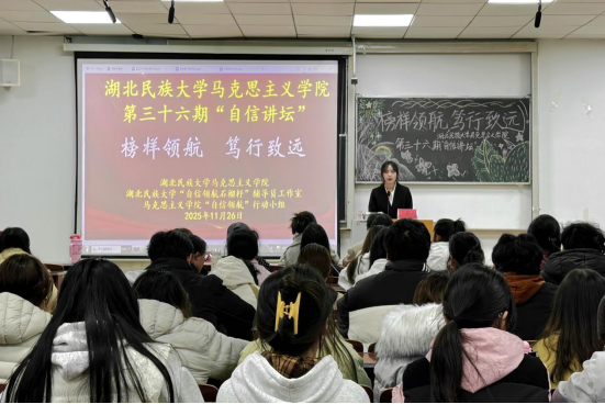 为充分发挥优秀学子的榜样示范作用,营造争先创优的良好学习氛围,11月26日,湖北民族大学马克思主义学院联合湖北民族大学“自信领航石榴籽”辅导员工作室、马克思主义学院“自信领航”行动小组,在德智楼9B210教室举办以“榜样领航 笃行致远”为主题的第三十六期“自信讲坛”活动。本次活动邀请学院2025年国家奖学金获得者胡裕君、代兴担任主讲人,与大一全体同学面对面交流分享,以亲身经历传递自信奋进的青春力量。