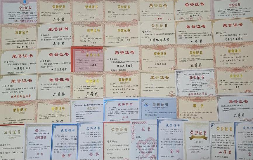 注:获第 10 届全国大学生生命科学竞赛创新创业类国家级二等奖、中国国际大学生创新大赛(2024)湖北省省级银奖、中国国际大学生创新大赛(2025)湖北省省级金奖、中国国际大学生创新大赛(2025)湖北省省级银奖、湖北省第 7 届我梦见楚天创客大赛省级银奖、第 2 届全国大学生职业规划大赛湖北省总决赛省级银奖、第 13 届湖北省挑战杯创业训练计划竞赛省级铜奖、2024年湖北省创青春创新创业大赛省级优秀奖、第 6 届宜荆荆恩创新创业大赛州赛第三名、连续两年获利川市华迅社会工作服务中心得优秀志愿者称号、2023~2024学年湖北民族大学优秀青年志愿者、一星级志愿者、2024~2025学年湖北民族大学优秀青年志愿者、五星级志愿者,累计获奖100余项。