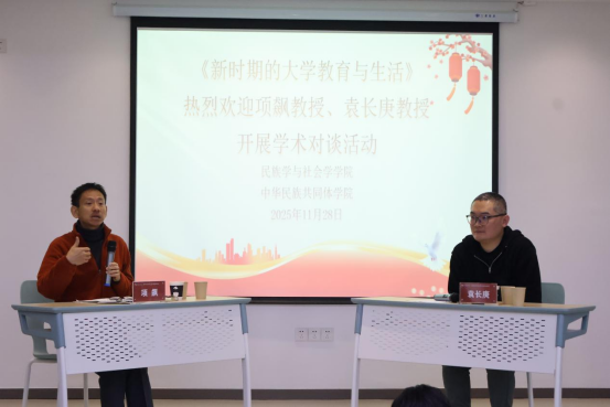(本网讯 记者 邱语欣/文 黄墨涵 陈萱/图)11月28日,我院在5B1212教室成功举办以“新时期大学教育与生活”为主题的学术对谈活动,德国马克斯-普朗克社会人类学研究所项飙教授与云南大学袁长庚副教授担任对谈嘉宾,对谈活动由党总支副书记申莉主持。