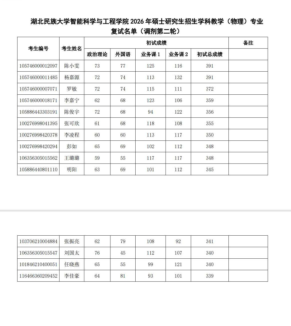 湖北民族大学智能科学与工程学院 2026 年硕士研究生招生学科教学(物理)专业复试名单(调剂第二轮)