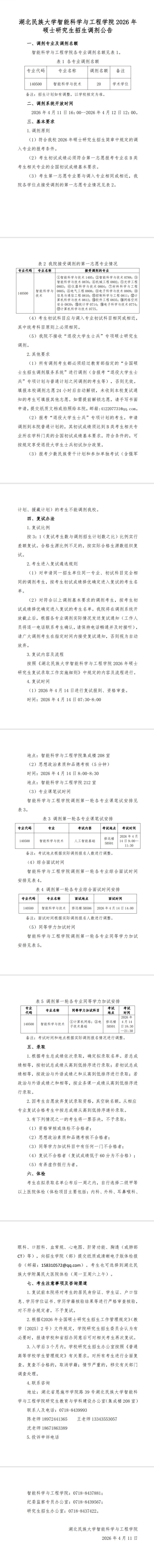 : 湖北民族大学智能科学与工程学院2026 年硕士研究生学科教学(物理)专业复试时间安排(调剂第二轮)