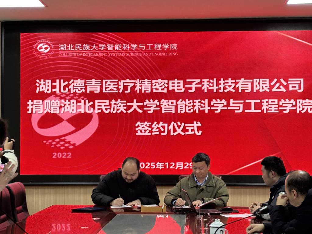 12月29日下午,湖北德青医疗精密电子科技有限公司向湖北民族大学智能科学与工程学院捐赠签约仪式在学院212会议室举行。此次合作旨在深化校企协同育人,搭建产学研融合发展平台,为地方产业升级与高校人才培养注入新动能。