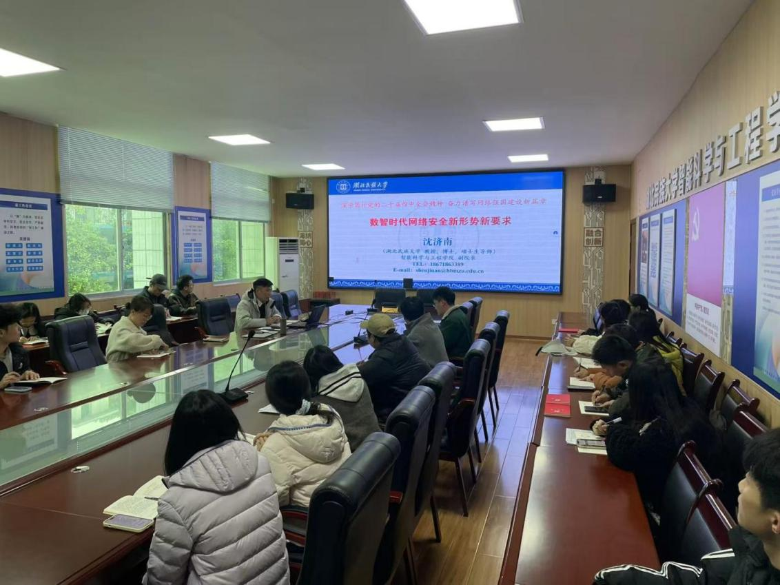 为深入学习宣传贯彻党的二十届四中全会精神,准确把握全会关于网信工作的新部署新要求,切实把思想和行动统一到党中央决策部署上来,2025年12月18日,湖北民族大学智能科学与工程学院研究生党支部在学院212会议室举办“数智时代网络安全新形势新要求”专题党课。学院党委委员、副院长沈济南担任主讲人,研究生党支部全体党员参加学习。
