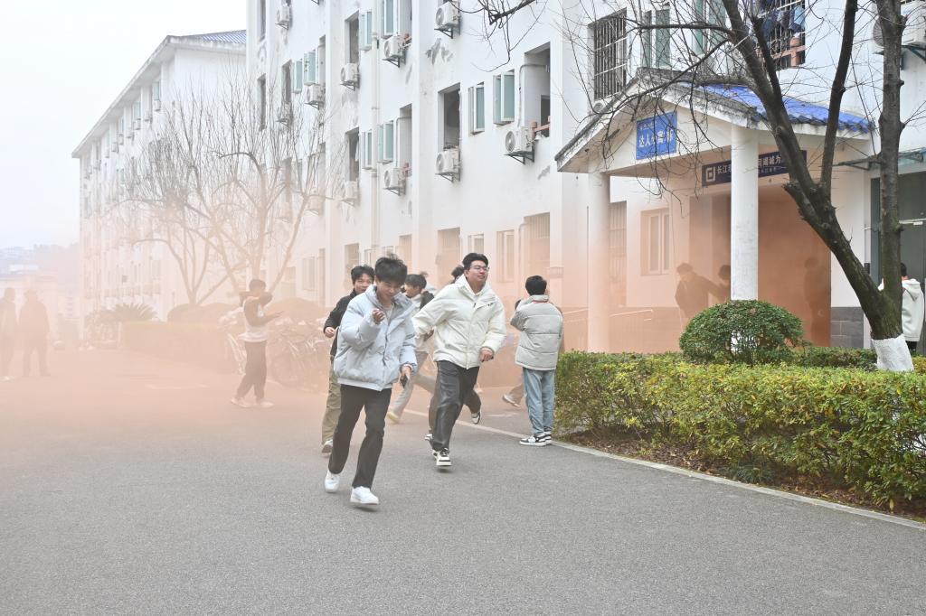 14:30,演练正式启动。随着火灾报警声响起,达人1栋门口迅速释放模拟烟雾,模拟真实火情场景。疏散引导组工作人员立即到位,按照预定方案有序引导楼内学生用湿毛巾捂住口鼻,采取弯腰低姿的正确姿势,沿疏散通道快速、有序撤离至修院楼A区前方空地安全区域。整个疏散过程紧张有序,师生响应迅速,未出现拥挤、慌乱等情况,充分展现了前期培训与筹备的成效。
