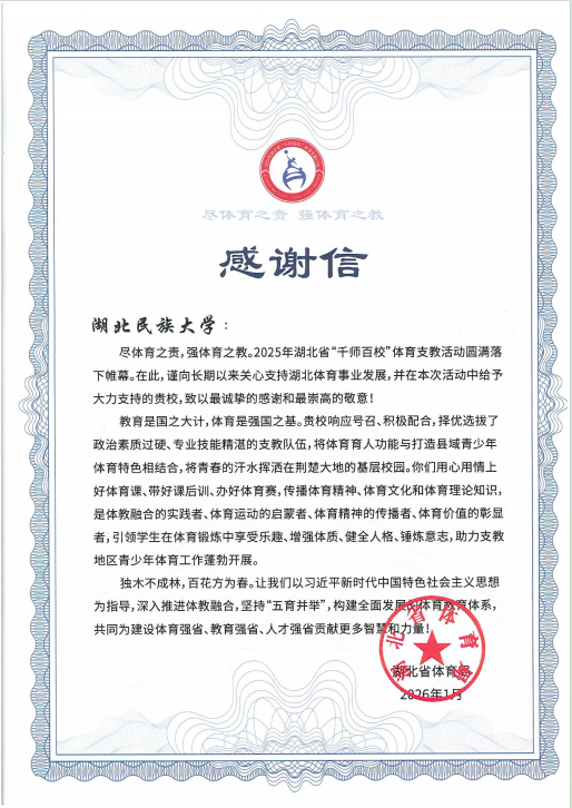 此次总结大会既是对过往工作的回顾与肯定,更是对未来征程的动员与部署。湖北民族大学体育学院将继续秉持“服务基层、奉献社会”的宗旨,持续优化支教工作机制,强化育人实效,为促进湖北省基层体育教育均衡发展、助力体育强省建设贡献更多“民大力量”。