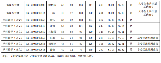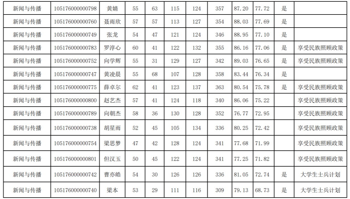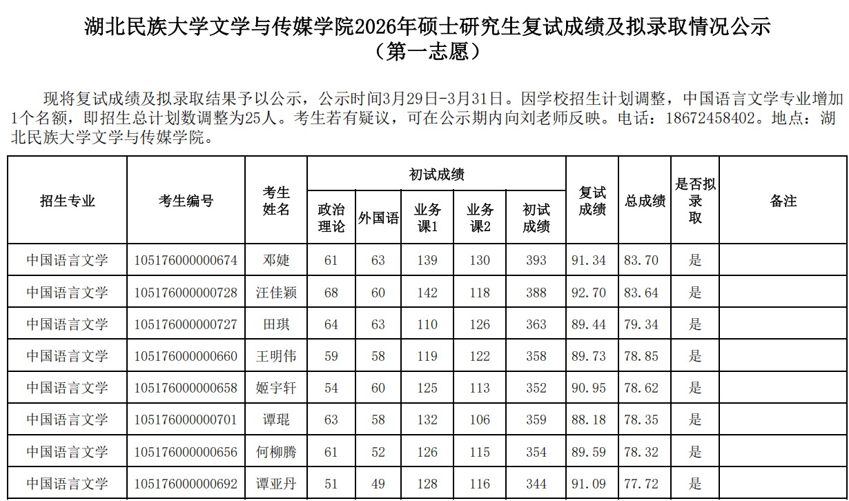 湖北民族大学文学与传媒学院2026年硕士研究生复试成绩及拟录取情况公示(第一志愿)