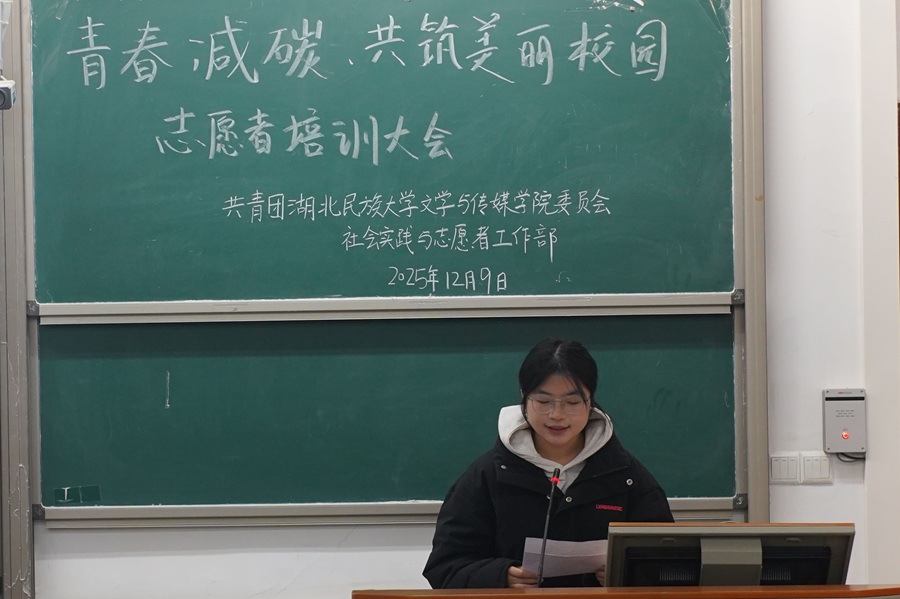 本网讯(记者 冷丽 李蓉华 莫秋萍(见习)/文 徐荣(见习) 李悠然(见习)/图)12月9日,共青团湖北民族大学文学与传媒学院委员会社会实践与志愿者工作部于修远楼5A101教室举行以“青春减碳·共筑美丽校园”为主题的志愿者培训大会。青年志愿者协会成员及硒望之光团队成员参加本次培训大会。