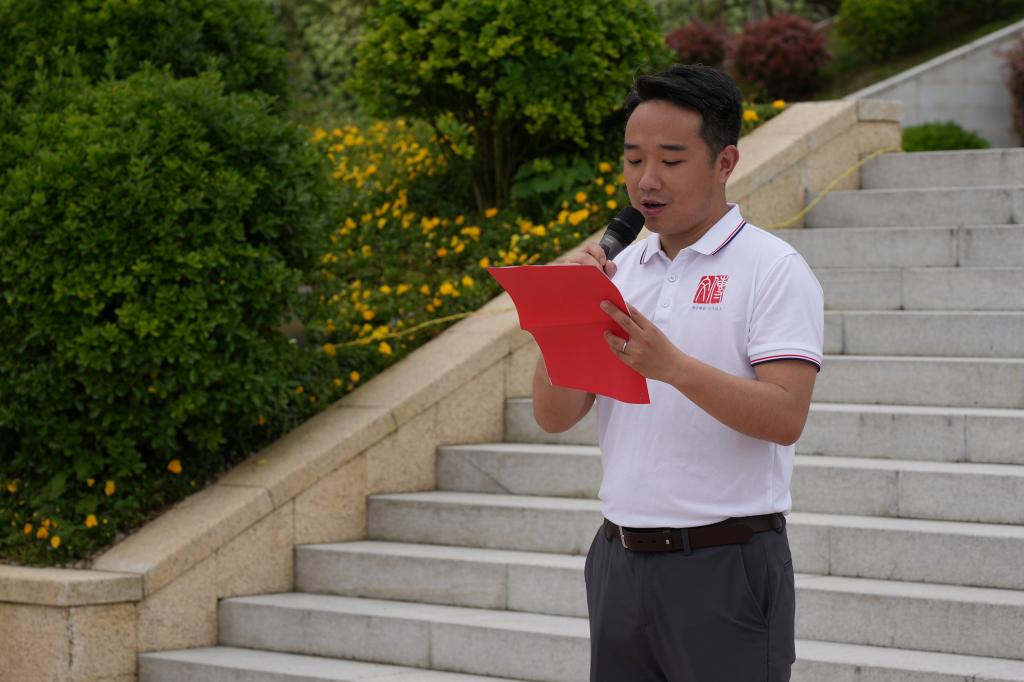 活动现场庄严肃穆,松柏苍翠环绕。全体团员统一着装、佩戴团徽,以崇敬之心开展缅怀仪式。团旗庄严入场,团员们面向团旗高举右拳,重温入团誓词,铿锵誓言回荡陵园;齐唱《光荣啊,中国共青团》,在激昂旋律中凝聚青春力量。团员代表缓步上前,向烈士敬献花篮,全体人员鞠躬默哀,深切缅怀何功伟烈士为革命事业英勇献身的崇高精神。