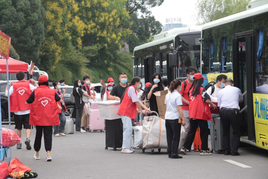 新生在红马甲志愿者引导下有序乘车