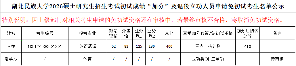 湖北民族大学2026硕士研究生招生考试初试成绩“加分”及退役立功人员申请免初试考生名单公示