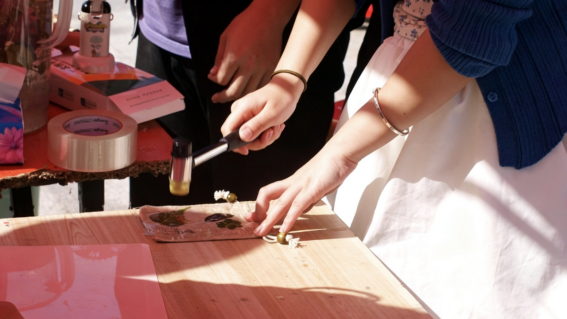 4月25日,湖北民族大学中医仲景协会与“心之桥”协会在桂花园广场,联合举办中草药拓印香囊DIY活动。